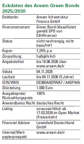 Der 7,25%-Green Bond der Aream Infrastruktur Finance GmbH kann unter www.aream.de/ir gezeichnet werden. Die Notierungsaufnahme im Open Market der Deutsche Börse AG (Freiverkehr der Frankfurter Wertpapierbörse) ist für den 17. März 2026 vorgesehen. Die Emission wird von der Lewisfield Deutschland GmbH als Financial